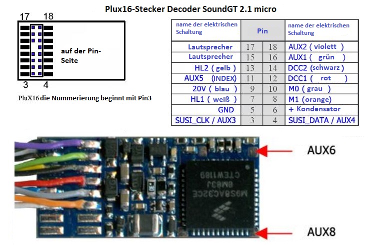 Der Decoderanschluss bei diesem Modell ist plux16. Wir werden einen ModelldepO micro sound GT 2.1 Sounddecoder und einen 16x25mm Lautsprecher einbauen.