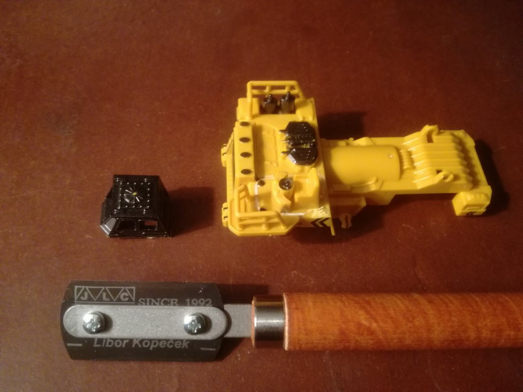 Kippmulde ausrasten, damit Baufreiheit ist. Der Rest ist trotz Stecknasen gut verklebt. Also Kabine absägen zum detaillieren.