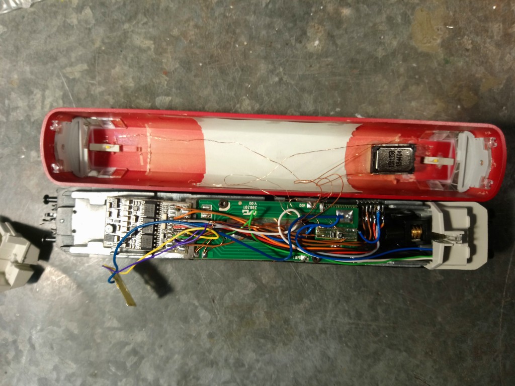 Zum Einsatz kommt ein Döhler und Haass SD 22A, der acht Funktionsausgänge besitzt. Die Lok wird später mal noch SD Kupplung bekommen, aber weil ich momentan keine da hatte, konnte ich diese noch nicht realisieren. Die Lok hat zwei Lautsprecher bekommen, einen im Tank, wie von Tillig vorgesehen und einen im Gehäuse. Der Decoder fand Platz hinter den Füherstand 2 und der LS hinter Führetstand 1, über den Antriebswellen. Bei der Inbetriebnahme, stellte ich fest, das es einfach unmöglich war, die Spitzen- und Schlußlichter, völlig separat von einander schalten zu können. Dies wird durch die Transitorschaltung auf der Lokplatine verhindert und ich stellte dann fest, das die LED Platine selbst ohne dies Transitorschaltung gar nicht funktioniert. Nun war guter Rat gefragt, denn einfach ablöten und an den Decoder dran, war nicht.