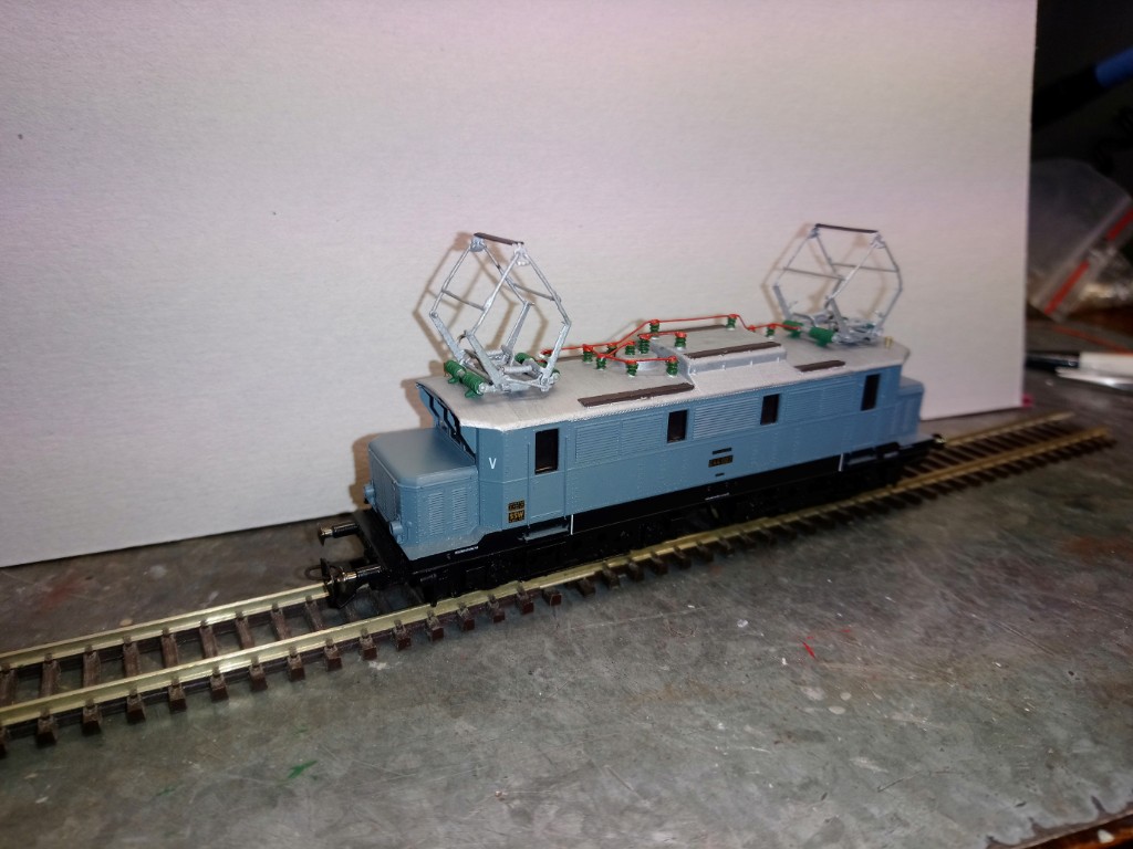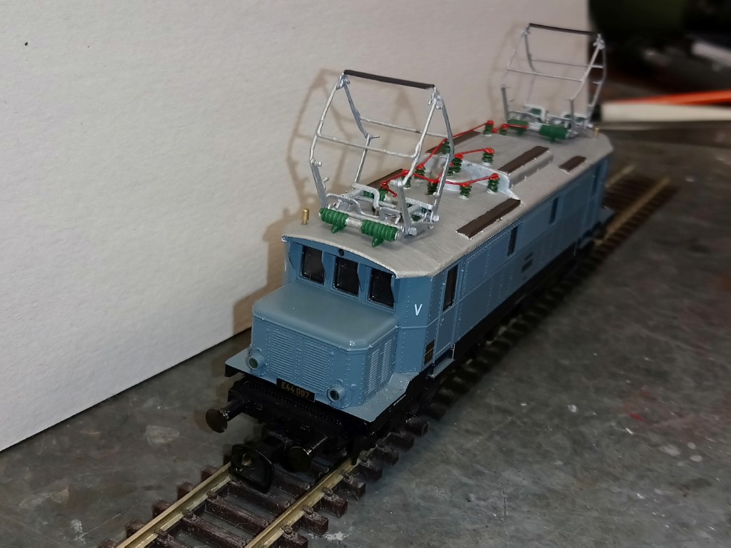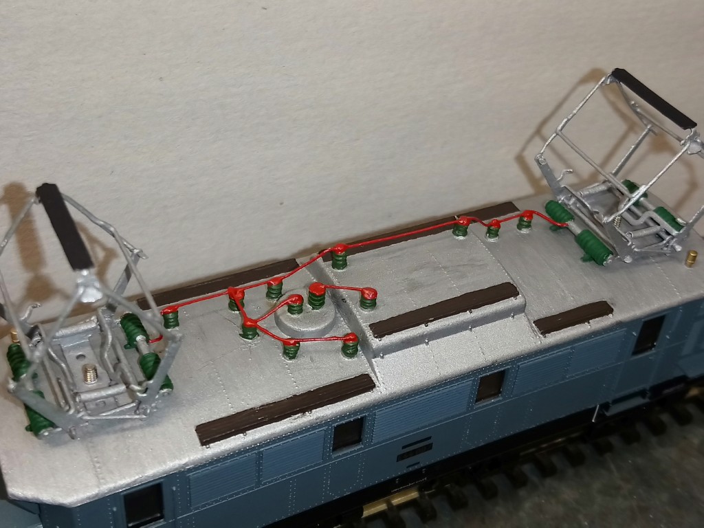 Die Vorgehensweise ist ähnlich, aber bei den Pantografen gibt es einen Unterschied, denn die sind diesmal von Sommerfeld, weil ich keine Brawa mehr zu bekommen sind. Somit habe ich auf die Teile von Ralf Nowak verzichtet und mir nur die übrigen geblieben Traversen genommen, um die Stützen für die Pantografen zu bauen. In die Traversen wurden Messing Rundstäbe auf einer Seite gelötet, die dann nach entfernen der Verbindungsstäbe der Sommerfeld Pantografen, durch diese ersetzt wurden. Man sieht das schön auf den Bildern. Wenn die neuen Verbindungsstäbe eingeschoben sind, dann muß auf der anderen Seite die zweite Traverse angelötet werden. Nach dem die erledigt war, habe ich die Stützen aus Messingblech selbst hergestellt, sowie mir aus dem Programm von Sommerfeld, die Isolatoren selbst geschnitten. Ich habe dies in Bilder dokumentiert, damit man das nachvollziehen kann. Als weiteten Schritt stand die Lackierung an und der Entscheid, welche Farbe ich nehme. Diverse Hersteller haben das Graublau im Sortiment, aber dies mußte ich mir erstmal ansehen, wie sie wirken. Dazu habe ich mir verschiedene gekauft umd sie auf ein weises Blatt papier aufgetragen, um vergleichen zu können. Irgendwie sind die mir alles zu grau. Brawa, Roco und Kiss verwenden Farbtöne, die ich als Originalgetreu einschätze, aber warum. Bei einem Besuch im DB Museum in Koblenz, sah ich in einer großen Vitrine ein Modelm einer E 18 in einem riesigen Maßstab, das wenn ich jetzt mich richtig erinnere, vorm zweiten Weltkrieg von Lehrlingen gabaut wurde, der Farbton ganz anderst aussieht wie man uns Modellbahnern immer vermitteln will. Mit viel auf das die E 18 in DRG Ausführung von Jatt genau diesen Farbton hat. Leider habe ich auf Anfrage, weder vom Museum noch von den Herstellern eine Auskunft bekomme, welchen Farbton man da verwendet.