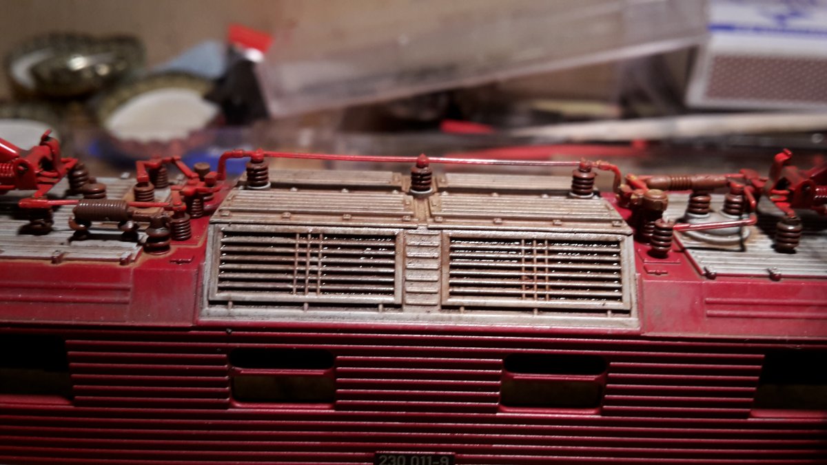 Natürlich erhält die Lok wieder einige Betriebsspuren. Wie schon im Umbaubericht zur BR211 von Tillig beschrieben, kommen wieder die stark verdünnten Elitafarben und die Pulverfarben zum Einsatz. Eigentlich sollte die BR230 nur eine sehr dezente Alterung erhalten. Im Ergebnis ist es doch etwas mehr geworden. Ist bei meine Alterungsversuchen fast immer so, dass das Ergebnis kräftige ausfällt als gewollt. Ich denke, das liegt auch an der Beleuchtung während des Alterns. Da sich unser Hobby ja meistens im Kunstlicht abspielt, wirken die Alterrungen immer dezenter als sie sind. Im Tageslicht wirkt es dann etwas kräftigen, aber seht selbst……….