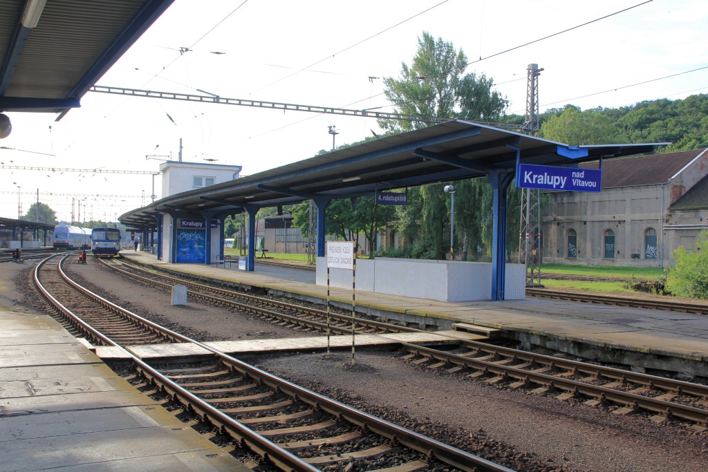 Bild 1: Kralupy nad Vltavou (Bahn-km 0,0), Abfahrtsstelle der Züge nach Velvary und Louny, der Kilometerstein dürfte der Nullkilometerstein nach Velvary sein.