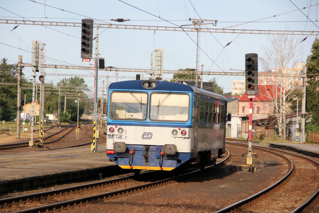 Bild 3: Kralupy nad Vltavou, ausfahrender Os 9726 nach Slaný (ČD-Triebwagen der Reihe 809)