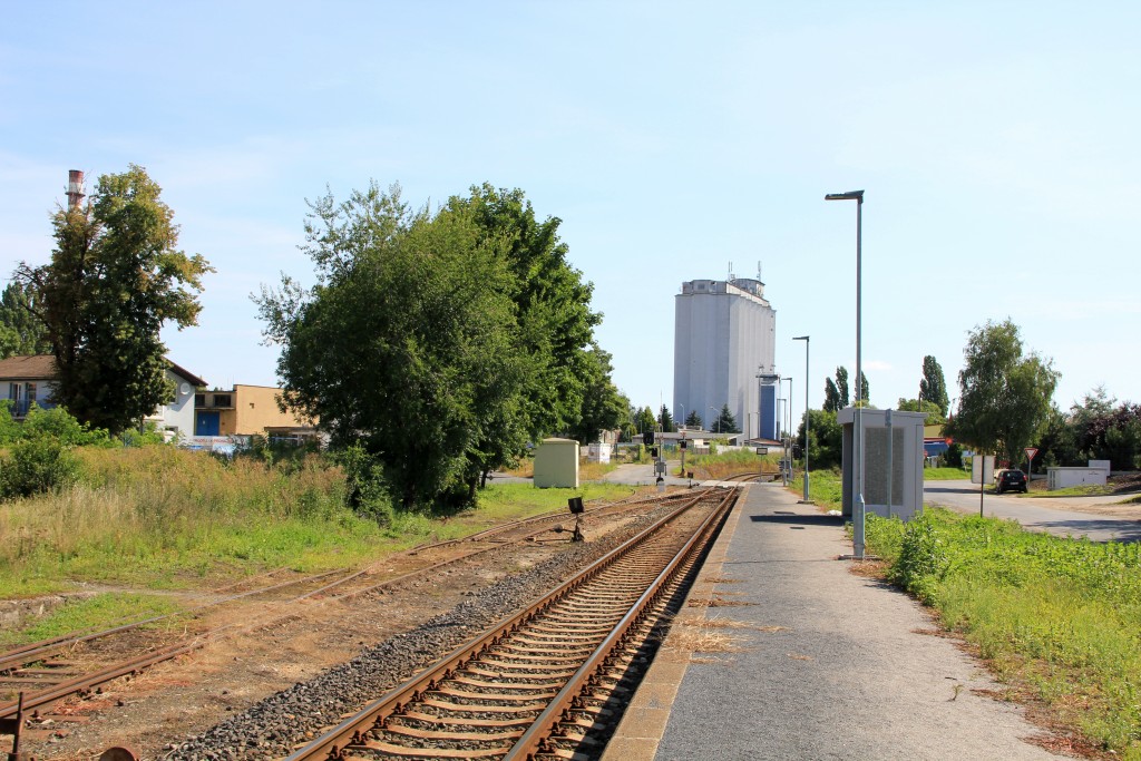 Die Haltestelle hatte und hat ein einseitig angeschlossenes Ladegleis. Von dort aus gibt es eine augenscheinlich noch genutzte Anschlussbahn zu einem Getreidespeicher. Es gibt eine Wartehalle aus Beton. Richtung Stadt folgt unterwegs noch ein Industrieanschluss.