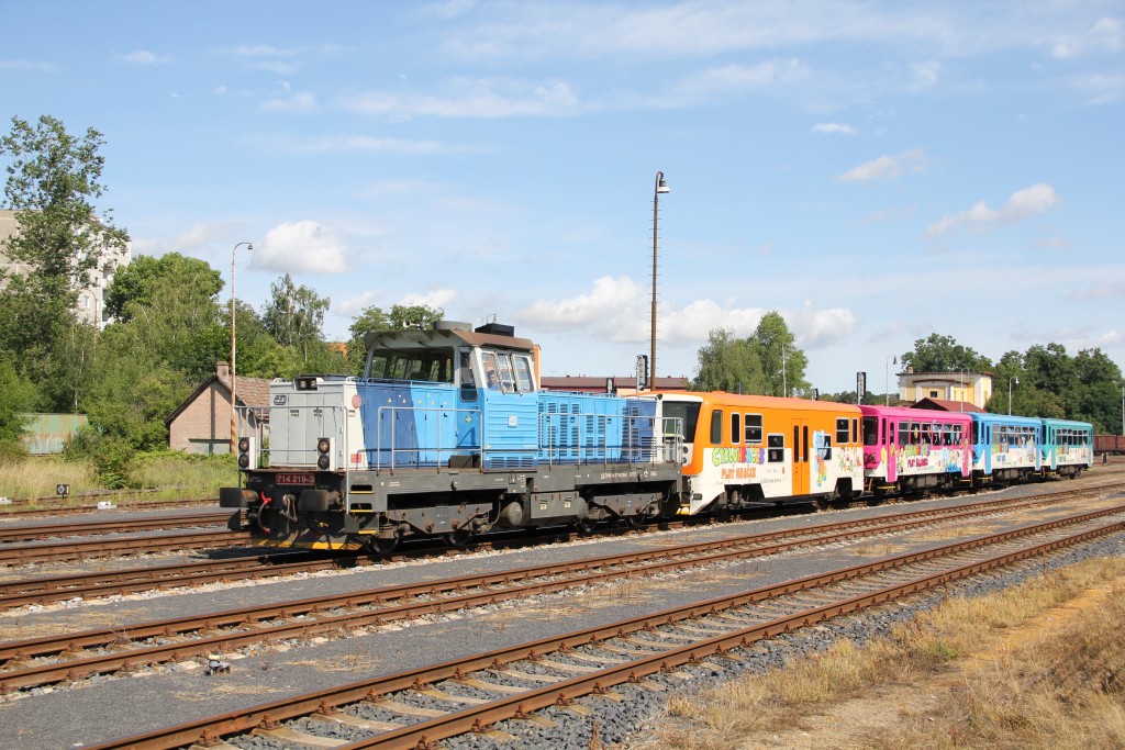 Bild 53: Slaný, ausfahrender Wochenendzug Os 9781 „Cyklohráček“ nach Praha hl.n. (ČD-Diesellok der Reihe 714 „Lego“)