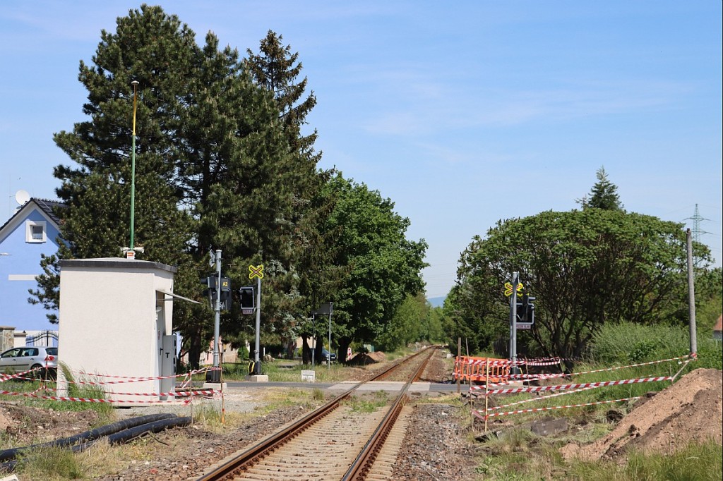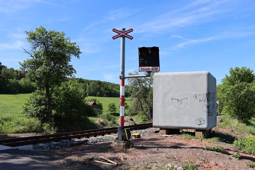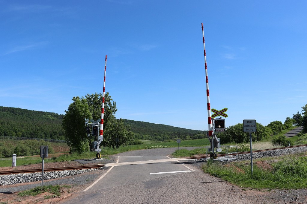 Bild 11: Domoušice, Bahnübergang mit nagelneuen Vollschranken
