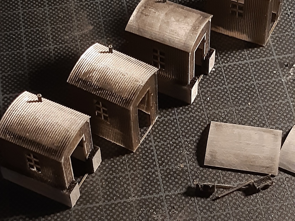 Die Variante mit Betonwänden und glattem Dach entspricht weitgehend dem nach den Fotos angenommenen Zustand vor dem Verfall. Wände ohne diese Betonummantelung und Wellblechdach habe ich ebenfalls konstruiert und als STL-Dateien abgelegt.