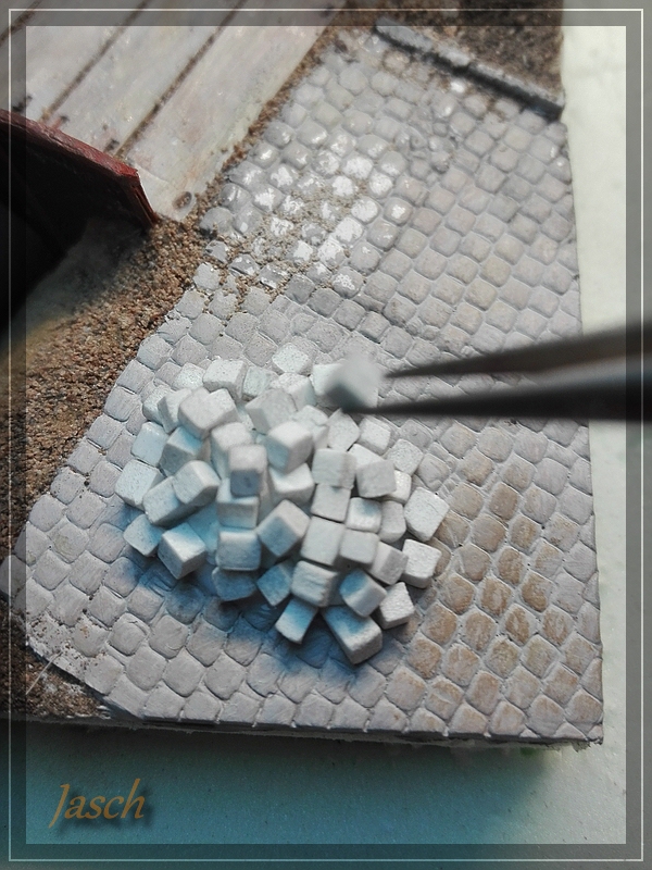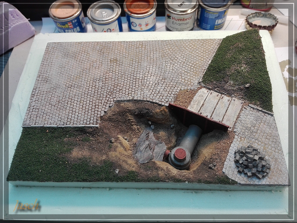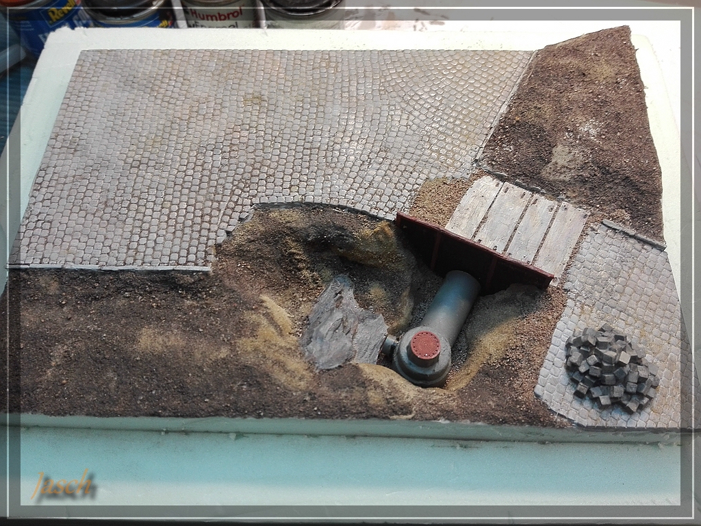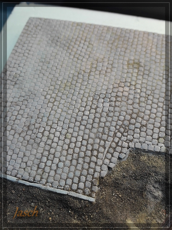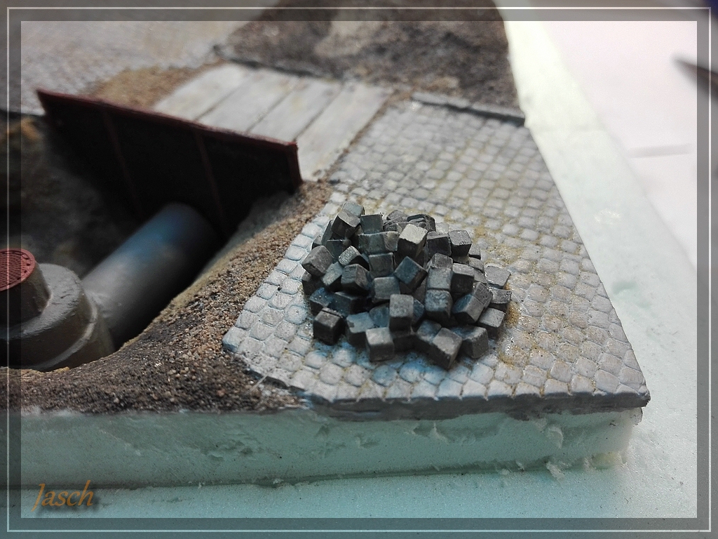 Straßenverlauf und Kanalbaustelle sowie Böschung sind vorbereitet, Forexplatte wurde passend zur Fläche geschnitten, diese sollte bündig abschließen um das ganze als Diorama seperat hinstellen zu können. Jetzt ein etwas zeitaufwändiger Part, Kopfsteinpflaster stempeln. Werkzeuge sind ja vorhanden da ich diese blöde Meise ja schon eine Weile habe (und jemand noch verückteren damit angesteckt habe)