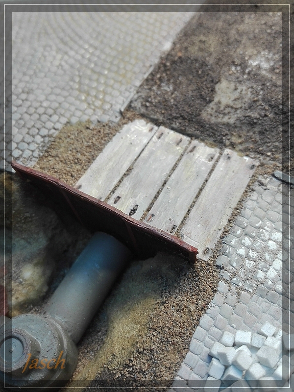 Dann die "Hilfsfahrbahn" Platten geschnitzt, gefärbt und gleich noch den Kanal mit Farbe bearbeitet. Die "Sperrholzplatte" zum Abfangen der Straße entstand aus einer Obstkiste. Gebeizt und mit Streifen aus Papier die einzelnen Platten dargestellt, geritzt um einzelne Bohlen nachzubilden.