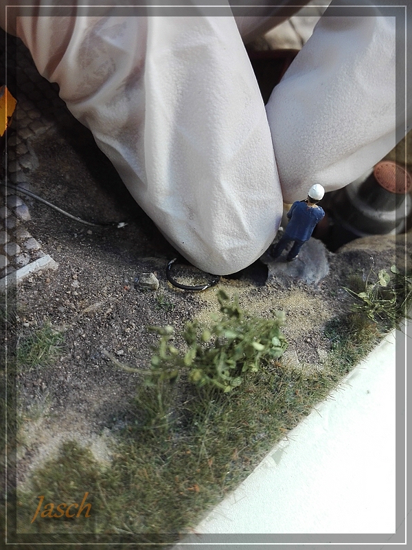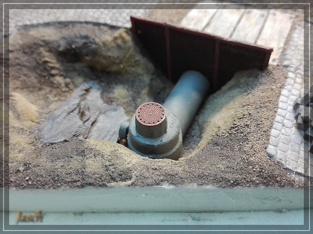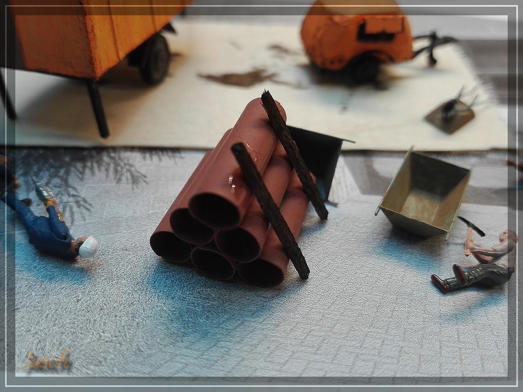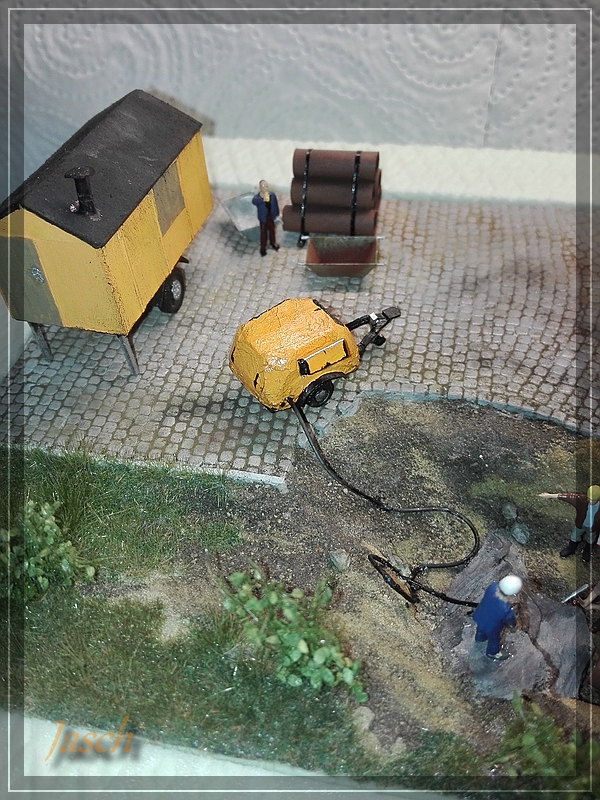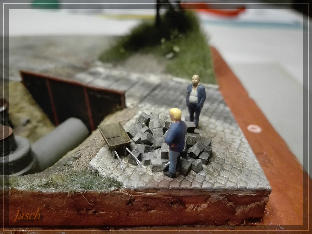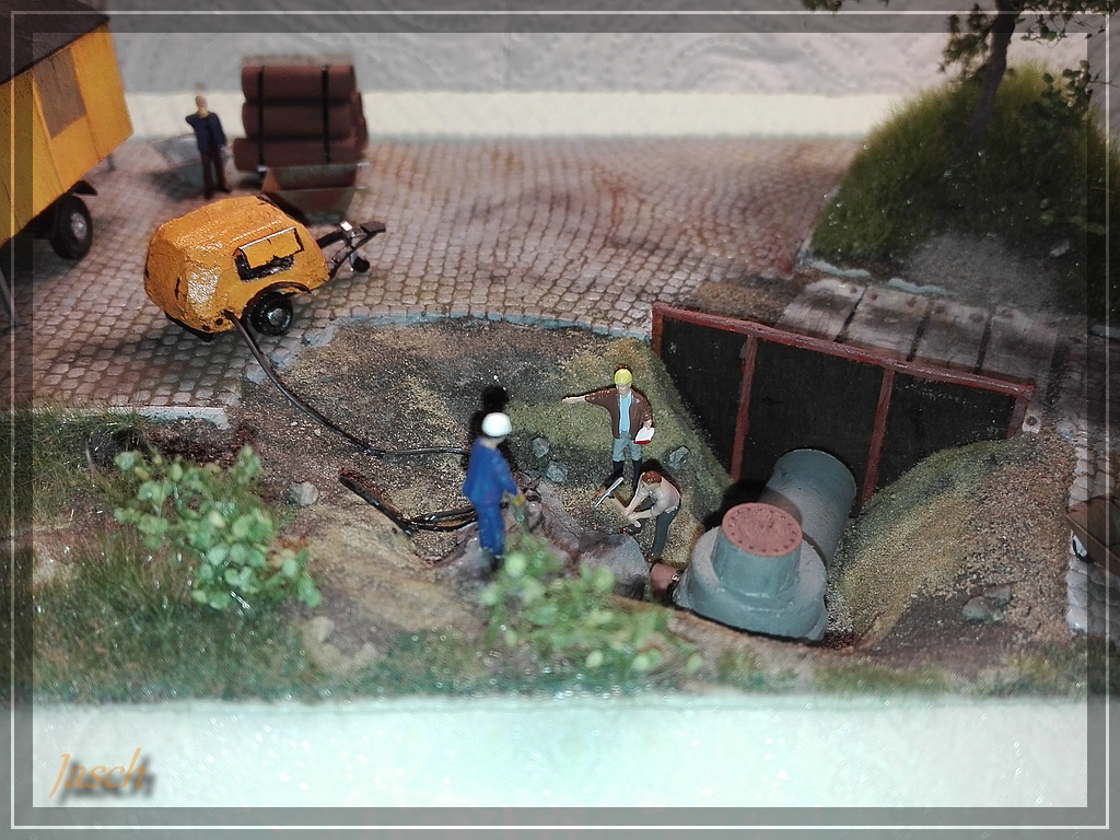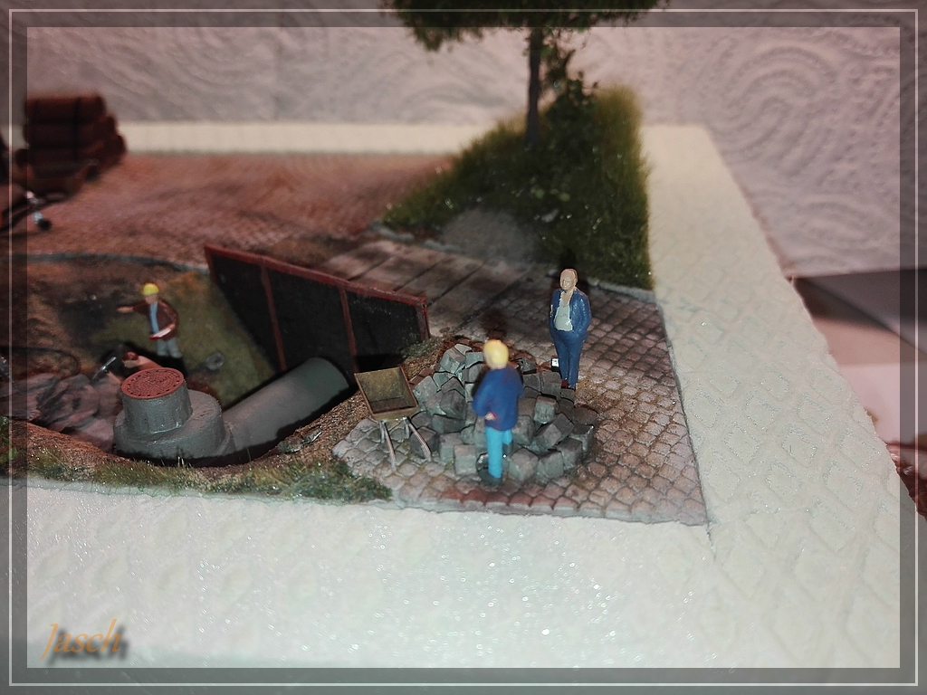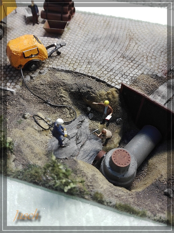 So kurz zum "bösen Felsen". Dieses kleine Arrangement zeigt so ein bisschen auch mein Findungscaos, die Jungs sollen eigentlich nur eine neue Kanalisation für "Unteröhrlesbach" bauen. Plaster aufnehmen, am großen Hauptkanal einen Schacht setzen und daran am Straßenrand des Bahnhofplatzes ein neues Rohr verlegen. Wie bei Jan seiner Suche nach dem passenden Objekt geht es den Bauleuten auch auf der Baustelle. Steckt so ein Blöder Felsen genau an der Stelle im Untergrund.