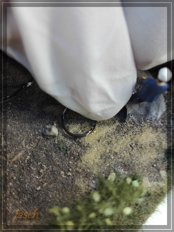 Dann ging es ans Verfugen der Pflastersteine, geht wirklich am besten mittels Finger. Dort auch wieder; Einkehren, Einnässen, Verkleben und hier noch >hoffentlich klappt das, zweiter Versuch fast unmöglich und wenn versaut dann richtig<. Auch meine Inge durfte dieses Mal nicht fehlen, irgendwer schaut mir halt doch immer auf die Finger.