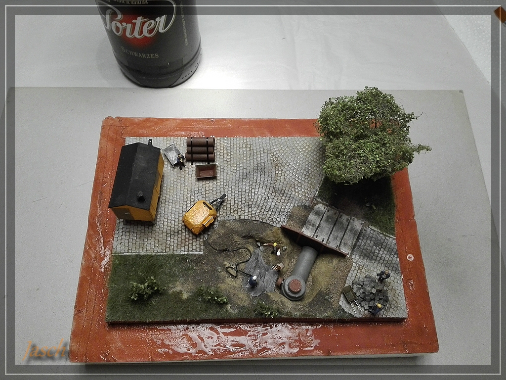 Gullideckel ist auch aufgebracht, jetzt geht es ans begrünen. Erst mit feinem Tuff, dann mit Begraser 1mm, 2mm und 4mm Fasern in Spätsommerlichen grün beschossen. Aus einer Laubmatte von Mininatur kleinere Büsche nachgebildet, kleinere echte Steinchen verteilt und zum Schluß noch ein kleines Bäumchen aus Draht, Filterwatte und mit Noch-Laub bestreut, ausgestaltet.