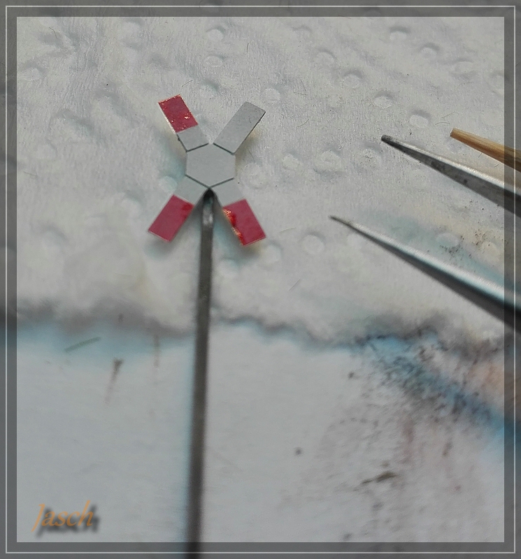 Kurzer Abstecher nochmal zu den Andreaskreuzen. Der Bausatz ist relativ simpel, zu falten ist nur die Halterung der Kreuze am Pfosten. Alles nach Anleitung. Dann nach dem verlöten mit weißer Grundierung übergesprüht (war alles in einem Rutsch, da mehrere Sachen grundiert werden mussten)