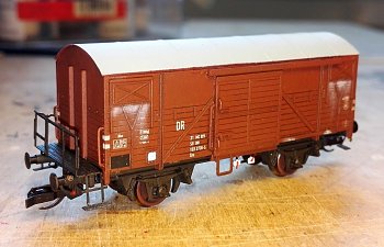 Am Wochenende war Bastelwetter, so das zwei Gs von Kunze verschönert werden konnten. Sie bekamen neue Puffer und einige Kleinteile. Die Dächer wurden geglättet, da beide Wagen ein Vorbild mit PVC Dach darstellen sollen.