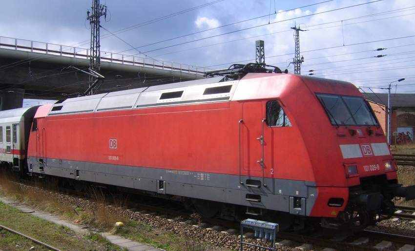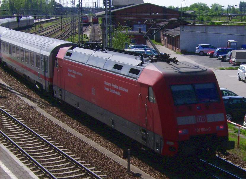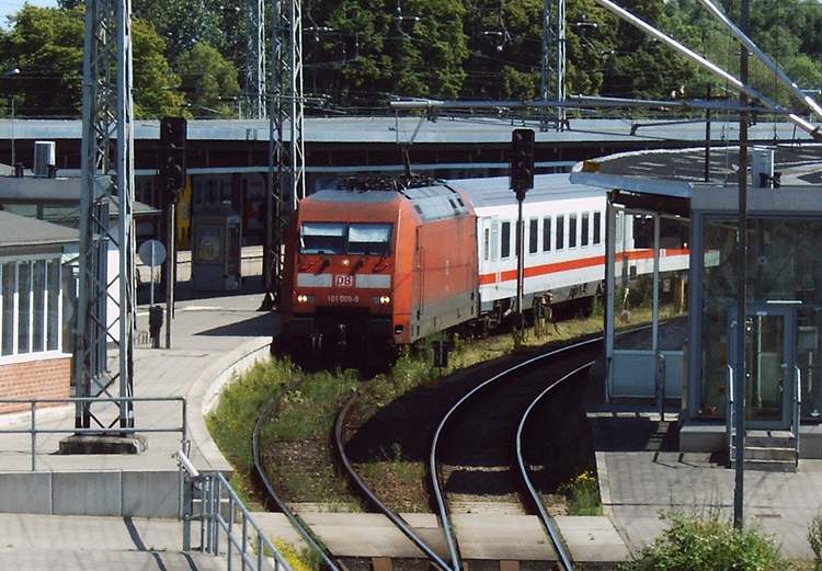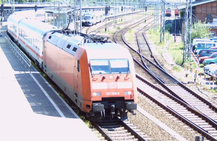 Im Anhang zwei Bilder von 101 009-9 bei der Abfahrt in Stralsund Hbf mit IC nach Stuggi.