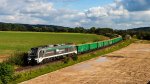 Die Lok hat in Altenburg Wagen von ERR geholt.5 blaue offene 4achsige Güterwagen und viele Schiebewandwagen .