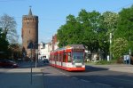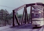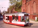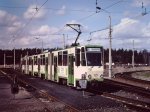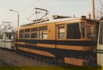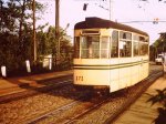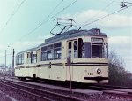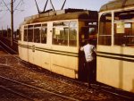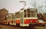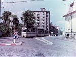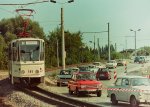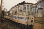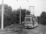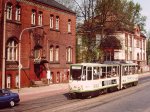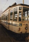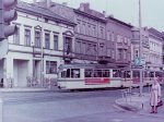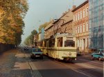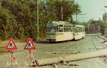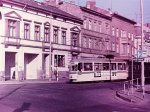 Wir sehen Tw 160 mit Werbung für das Brandenburger Theater in der August-Bebel-Straße. Im Zuge des Straßen- & Brückenausbaus wird die Trasse begradigt & verschoben. Der Zug fährt noch auf dem alten Gleis.