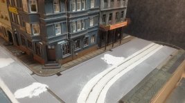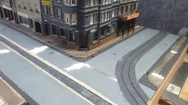 Das Kopfsteinpflaster zwischen den Straßenbahnschienen habe ich mit einem Straßenroller von Railnscale in die DAS Modelliermasse eingedrückt. Das restliche Kopfsteinpflaster sind Platten, Bordsteinkanten und Rinnsteine von Auhagen (42656). Verspachtelt mit normaler Spachtelmasse vom Baumarkt.