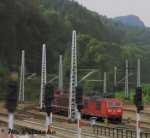 ...nur Masten und Quertragwerke, jedoch keinen Fahrdraht. ..optisch halbwegs vernünftige Mastabstände, in die mehr als nur eine Lok paßt. Pantographen sind mit Fäden oder kleinen, eingesteckten Drähten in der Höhe begrenzt.