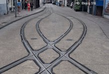 Rechts sieht man das Hinweisschild - es wird wohl nicht immer wahrgenommen. Problem: Parallel zum Straßenbahngleis wurden rechts davon helle Steine in die dunkle Fahrbahn eingelassen, die fast ganz rechts am Ende der gemeinsamen Trasse beginnen. Kurz davor ist zwar ein Schild mit dem Hinweis auf die Trassenteilung, aber es wird wohl nicht immer wahrgenommen. Folgt man den hellen Steinen, landet man im nicht von Straßenfahrzeugen befahrbaren Bereich der Straßenbahngleise.Da die neue Strassenbahn Strecke am Buckauer Bahnhof seit einiger Zeit in Betrieb ist, hier zum Abrunden des Themas einmal einige Bilder von der Gleisverschlingung im Betrieb.
