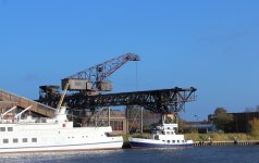 Direkt daneben befindet sich eine Fördernalage zum Beladen von Schiffen mit Schüttgütern. Auf Google Maps kann man derzeit (noch) in der Satellitenansicht sehen, wie ein Schiff damit beladen wird: