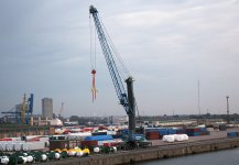 An der gleichen Pier arbeiten auch zwei Liebherr LHM 550. Im Parallelhub haben sie eine max. Hublast von 130t. Hier einer der beiden Exemplare. Die Container im Hintergrund befördert DB Cargo Eurasia auf der "neuen Seidenstraße".