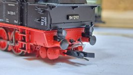 Meine 94er hat ein kleines Problem mit der hinteren Kupplung, die müsste meiner Meinung nach noch ein winziges Stückchen nach Rechts (auf dem Foto nach unten) bewegt werden, damit der Fallhaken am anderen vorbei gleitet. Bei der Lok steht er so genau gegenüber mit dem vom Wagen, wodurch sie sich beim Ankuppeln gegenseitig blockieren.