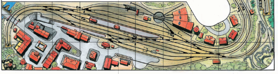 Dat habe ich erstmal dorthin gesetzt um eventuell Packwagen auf das Gleis links neben dem Lokschuppen schieben zu können. Mal schauen. Vielleicht lasse ich auch beide weg. Werden wir dann sehen.Das Gleis an der Drehscheibe nach unten würde ich weglassen.