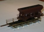 Die Querträger sind mit Sekundenkleber auf den Brückenträger aufgeklebt. Das Geländer ist von Weinert, passt nicht so 100% zu einer Brücke, war aber vorhanden und einfacher zu realisieren als der Standard aus L-Profilen. Auf der anderen Seite bin ich mir sicher, dass es irgendwo auch Brücken mit einer derartigen Geländerbauart gibt ... Die Pfähle sind auf die Ms-Träger aufgelötet, die Drähte wieder nur eingeklebt.