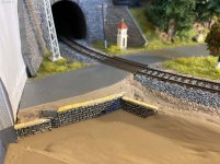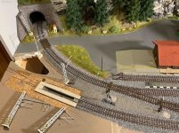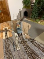 Gleis 3a soll kein Schutzgleis sein, eher Ladegleis für den MUV 69 nebst Beiwagen (den ich noch von HekTTor haben will) oder Abstellgleis für alle möglichen Fahrzeuge, wie Schneepflug, alte Tender, Bauwagen und eben auch Elloks. Von daher muss das erste Stück überspannt werden.