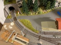 Fangen wir auf der einfachen linken Seite an. Das Portal taugt nicht wirklich für Oberleitung. Aber wie in vielen Tunneln kann auch hier die OL später eingebaut sein. Das Tragseil kann zur größten Not am Portal enden. Das Ganze spart dann einen Abspannmast und macht es etwas ruhiger...