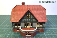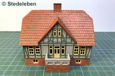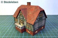 Langsam entwickelt sich die Dachform. So simpel die Geometrie, so fummelig ist es dennoch, die aus den Strukturplatten zugeschnittenen Dreiecke aneinander wie auch an die Giebelwände anzupassen. Dazu wollen an den Stoßkanten zwei Millimeter breite Fasen im exakten Winkel gefeilt und zu den Hauptdachflächen annähernd glatte Klebeflächen hergestellt sein. Die Teile dann präzise aufzukleben, ist nichts für sensible Gemüter: Jeder Tropfen danebengelaufener Klebstoff löst sofort die Struktur der Biberschwänze an. Doch selbst bei bestem Bemühen bleiben in der Regel Lichtspalte zwischen den Einzelteilen. Da jedoch vor der Weiterbearbeitung ohnehin Stabilität in die Konstruktion gebracht werden muß, lasse ich für gewöhnlich von der Rückseite her eine Naht aus Zweikomponentenkleber hineinlaufen. Wenn man schnell genug arbeitet, zieht der Kapillareffekt das noch flüssige Gemisch in diese Spalten und bewirkt auf der Ansichtsseite sehr saubere Übergänge. Diese verschwinden am Ende unter der Alterung des Daches.